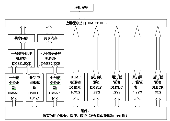 七號信令處理機(jī)程序,單獨運行,用戶通過DMICP.DLL與其以共享內(nèi)存的方式通訊,用于處理七號信令消息,必須在用戶程序啟動前運行。在其配置文件 DMSS7.CFG中必須定好數(shù)字中繼接口板的槽位,七號信令板可以任意位置