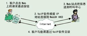 目前來講,把語音和Web在網(wǎng)絡(luò)上結(jié)合起來的理想途徑是VoIP。Web上的VoIP呼叫工作原理如圖1所示?蛻籼顚懸恍┗镜目蛻糍Y料后,點(diǎn)擊呼叫按鈕呼叫座席員。如果用戶的資料已經(jīng)在數(shù)據(jù)庫中的話,座席員就可以直接從瀏覽器上看到與該客戶相關(guān)的信息;如果用戶是第一次進(jìn)入呼叫中心,座席員的瀏覽器上就會(huì)提示向客戶詢問并記錄客戶信息。對(duì)客戶來說,只需要一臺(tái)接入Internet的多媒體電腦和免費(fèi)的客戶端軟件就可實(shí)現(xiàn)Web瀏覽和交談功能。