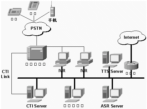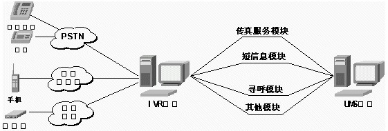 TTS系統(tǒng)、VXML系統(tǒng)、UMS系統(tǒng)與已有IVR(電話語音自動應(yīng)答系統(tǒng))平臺、Internet、PSTN結(jié)合的示示意圖如下: