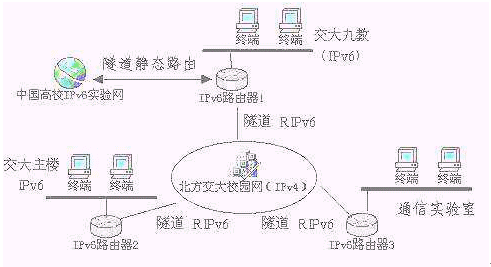 FH6501(IPv6路由器)已經(jīng)在北方交通大學(xué)學(xué)生IPv6實驗床實際安全運(yùn)行了六個月。北方交通大學(xué)學(xué)生IPv6實驗床采用我公司IPv6路由器產(chǎn)品,架構(gòu)了三個主節(jié)點(diǎn),借助隧道連接到由Nokia資助建設(shè)的中國高校IPv6實驗床。目前三個主節(jié)點(diǎn)之間的連接是借助于學(xué)校原有的IPv4網(wǎng)絡(luò),通過隧道技術(shù)實現(xiàn)節(jié)點(diǎn)間的通信(見圖示)。