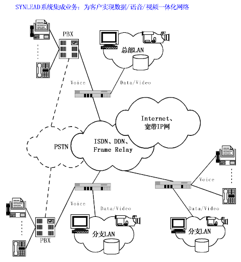 在這里,數(shù)據(jù)/話音/視頻一體化網(wǎng)絡(luò)主要是指多分支機構(gòu)集團化企業(yè),通過ISDN、DDN、Frame Relay、Internet、寬帶IP等廣域網(wǎng)互聯(lián)手段,實現(xiàn)Data/Voice/Video"總線復(fù)用"的增值技術(shù)。