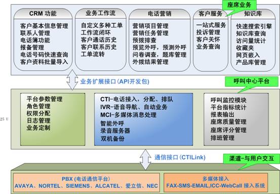 包含了PBX、CTI服務(wù)器、IVR/FAX服務(wù)器、錄音監(jiān)控 系統(tǒng)、報(bào)表統(tǒng)計(jì)系統(tǒng),CRM客戶管理等。
