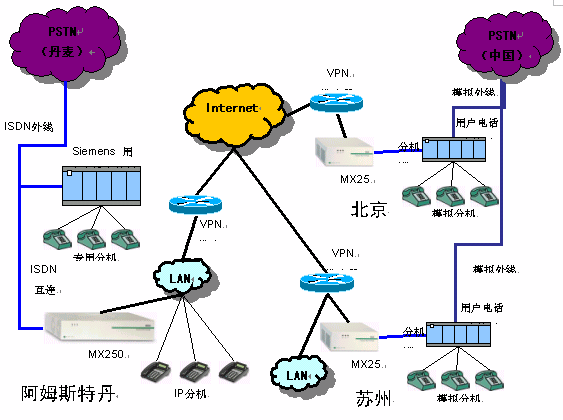 在阿姆斯特丹配置一臺MX250交換機,通過ISND連接原有交換機及丹麥PSTN網(wǎng)絡(luò),北京安裝一臺MX25網(wǎng)關(guān)與原有集團電話互聯(lián),蘇州安裝一臺MX25與原有呼叫中心互聯(lián),三點通過基于Internet的VPN組成專用VOIP網(wǎng)。
