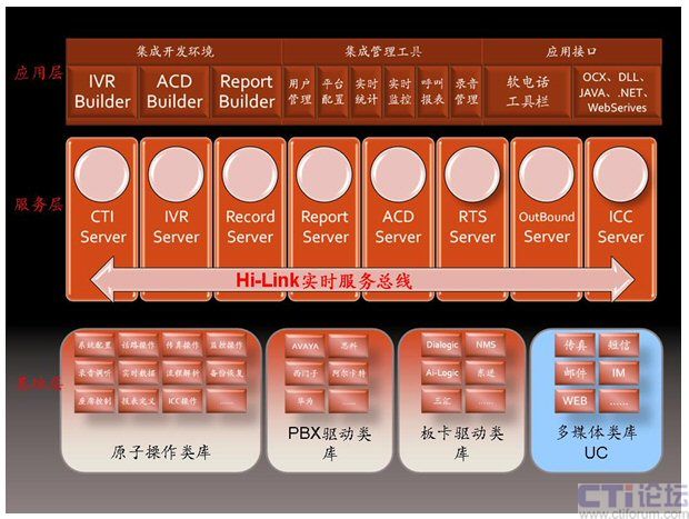 在擁有第五代呼叫中心Hi-Link核心軟件的商路通公司看來(lái),呼叫中心軟件架構(gòu)包含三層,基礎(chǔ)層、服務(wù)層和應(yīng)用層。而統(tǒng)一通信UC應(yīng)從劃入基礎(chǔ)層及服務(wù)層之中,PBX驅(qū)動(dòng)類(lèi)庫(kù)和板卡驅(qū)動(dòng)類(lèi)庫(kù)處理電話媒體的請(qǐng)求,而多媒體類(lèi)庫(kù)用于處理其他統(tǒng)一通信的媒體,如傳真、短信、電子郵件、均包含在多媒體類(lèi)庫(kù)之中。傳真、短信、電子郵件等請(qǐng)求分別由FAX SERVER、SMS SERVER 、E-mail SERVER處理。由ICC處理網(wǎng)上音頻、網(wǎng)上視頻、文本交談、文件傳輸、護(hù)航瀏覽、應(yīng)用共享、桌面共享和電子白板等媒體的請(qǐng)求。