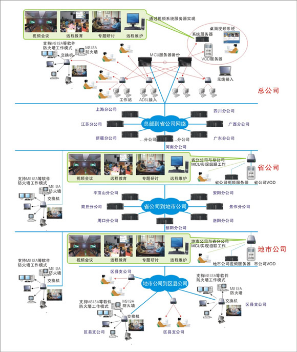 整個(gè)網(wǎng)絡(luò)覆蓋到遍布全國各地的省級(jí)分公司35家,二級(jí)分公司348家,縣級(jí)分公司2667家,營業(yè)網(wǎng)點(diǎn)幾千個(gè),整個(gè)網(wǎng)絡(luò)共400多臺(tái)MCU,5000多個(gè)終端。整個(gè)系統(tǒng)采用三級(jí)級(jí)聯(lián)樹狀組網(wǎng),各級(jí)分級(jí)分權(quán)管理,全網(wǎng)統(tǒng)一調(diào)度,全網(wǎng)終端統(tǒng)一開會(huì)。