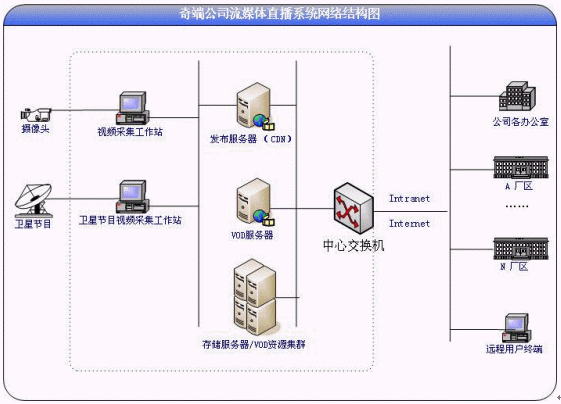 用于奇瑞公司的視頻直播系統(tǒng),是典型的基于以太網(wǎng)的網(wǎng)絡(luò)視頻直播應(yīng)用。奇瑞公司對(duì)該系統(tǒng)的用途較為重要,因此,視頻直播時(shí),對(duì)聲音畫(huà)面的同步性要求更為嚴(yán)格,畫(huà)面和聲音的延時(shí),將使得培訓(xùn)人員容易有反感情緒,因此系統(tǒng)的處理能力十分重要,同時(shí),考慮到今后培訓(xùn)人員的數(shù)量,有可能會(huì)超過(guò)一般的直播人數(shù),也為了提高培訓(xùn)的效率,直播系統(tǒng)的并發(fā)量需要達(dá)到1000人以上。還要求系統(tǒng)平臺(tái)的在線(xiàn)可擴(kuò)展能力強(qiáng)、技術(shù)實(shí)現(xiàn)上具有一定的先進(jìn)性。