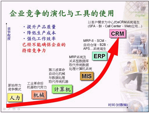 過去企業(yè)為取得同業(yè)間之競爭優(yōu)勢,無不絞盡腦汁針對『產(chǎn)品質(zhì)量』、『生產(chǎn)成本』及『工作效率』等作為主要改善目標(biāo),除了從本身管理制度的檢討改進(jìn)外,同時也積極運(yùn)用現(xiàn)代信息科技的力量,規(guī)劃出適合自己的企業(yè)e化版圖,以因應(yīng)全球化競爭時代的來臨,在此同時許多信息系統(tǒng)也逐步推動導(dǎo)入企業(yè)內(nèi)部,包括:早期的MIS系統(tǒng)、近期的ERP系統(tǒng)、甚或電子簽核系統(tǒng)等,主要目的為提升內(nèi)部工作效率、節(jié)省內(nèi)部生產(chǎn)成本等作準(zhǔn)備,以『節(jié)流』為目標(biāo)強(qiáng)化企業(yè)自身的競爭能力。