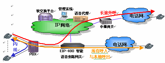 EIP-480設備處于企業(yè)PBX(電話交換機)和PSTN(固定電話網)之間。它具有呼叫智能選路功能,支持通過判斷被叫號碼,自動將異地企業(yè)間或外部長途電話旁路到IP網絡上。