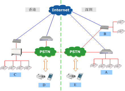 在A點(深圳office)放置一臺IP PBX(RT-CCP1000),租用E1線路接入SZ PSTN,同時接入到Internt;在香港某電信機房放置一臺IP