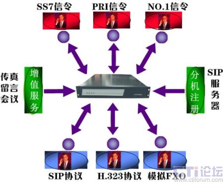 融天科技智能中繼網(wǎng)關(guān)能解決傳統(tǒng)交換網(wǎng)與軟交換網(wǎng)絡(luò)的互連互通問題,能解決跨區(qū)域的企業(yè)辦公電話系統(tǒng)互連互通問題。還能能提供先進(jìn)的號(hào)碼變換以及智能路由功能,內(nèi)置式增值業(yè)務(wù)模塊不需要增加任何其它硬件設(shè)備即可擁有電話會(huì)議服務(wù)、語(yǔ)音信箱服務(wù)、個(gè)人傳真服務(wù)、一號(hào)通服務(wù)等功能;內(nèi)置式SIP服務(wù)器、GK模塊能為各類型IP終端、軟終端、IAD等提供注冊(cè)功能,還能實(shí)現(xiàn)模擬用戶分機(jī)和IP用戶分機(jī)擴(kuò)展。如下所示:
