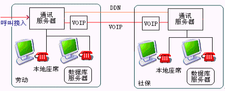 如某些城市勞動和社保是業(yè)務分開,為共用12333接入號可采取此種方式,在呼叫首次接入時提示用戶選擇勞動、還是社保咨詢服務,如果選擇社保服務則通過DDN專線或VOIP將呼叫接入到社保的交換機中。