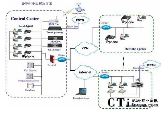 - 服務中心網絡化——充分利用IP話機的靈活移動和免費特點,服務中心的人工坐席可以靈活設置;