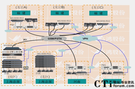 - 上海接入采用電信30B+D線(xiàn)路兩條。使用2E1的MG3000-T4設(shè)備接入。上海南區(qū)IP分機(jī)600門(mén),北區(qū)IP分機(jī)300門(mén),全部采用MG3000-R32(32FXS)設(shè)備做接入。福建龍巖A、B、C,江西高安,河南鄭州這5個(gè)分支分別采用16FXO口網(wǎng)關(guān)與PBX或電信虛擬網(wǎng)直線(xiàn)互聯(lián)。