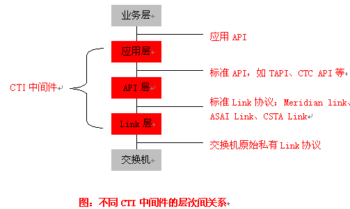 根據(jù)CTI的功能定位,我們可以把CTI中間件產(chǎn)品劃分為不同的層次,一般地可分為三種類型:Link層產(chǎn)品、API層產(chǎn)品、應(yīng)用層產(chǎn)品,其分層結(jié)構(gòu)示意圖如下所示: