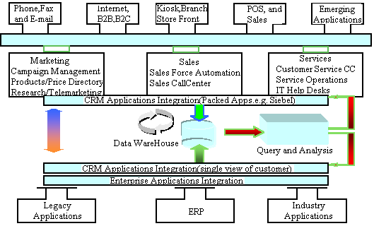 傳統(tǒng)的數(shù)據(jù)庫(kù)及中間件軟件廠商,都能提供一些“point solution”(指基于某一單獨(dú)技術(shù)領(lǐng)域),例如,單獨(dú)的客戶服務(wù)CallCenter方案,數(shù)據(jù)倉(cāng)庫(kù)/商業(yè)智能BI解決方案。Compaq向客戶提供的是完整的CRM方案套件,其技術(shù)組成主要包括前端的基于多種接觸媒體(phone,fax,email,web)CallCenter;核心部分的Sales Force Automation,Marketing Automation,Service Operation;以及后端的DataWareHouse/BI,ERP及原有集成應(yīng)用系統(tǒng)(Legacy Application)的集成等部分。通過(guò)下圖我們將詳細(xì)描述康柏的整體CRM方案框架及其解決方案: