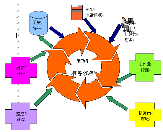 如上面所描述的WFMS流程,最初開(kāi)始于歷史的電話信息、目前的ACD數(shù)據(jù)和服務(wù)代表的簡(jiǎn)介。從這些綜合的信息,做出對(duì)工作量的預(yù)測(cè),從而從本質(zhì)上決定了配備給呼叫中心的服務(wù)代表數(shù)量。了解了服務(wù)代表的需求數(shù)量,一個(gè)適用于任何時(shí)間段的工作時(shí)間表就可以產(chǎn)生了,包括每天的,每周的,每月的;谶@一點(diǎn),主管人就可以監(jiān)控服務(wù)代表的行為,追蹤來(lái)電,并分析不同種類的來(lái)電分組,做出應(yīng)對(duì)假定情景的方案,從而產(chǎn)生各種各樣的報(bào)告和圖表。