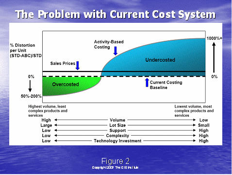 如果該行動與生產產品相聯(lián)系,服務被用于把成本分配到每一個產品單元上,則一個不同的圖將會出現(xiàn)。綠色陰影下的曲線是正確分配的成本——它是量大最不復雜的產品的曲線,成本要低得多;藍色陰影上的曲線是量少更復雜的產品的成本。這種成本分配的方法叫做行動成本計算法,是根據(jù)生產產品和服務所需的活動量而分配的。目前的成本分配的財務方法叫標準財務法,它沒有考慮涉及到生產產品和服務所需的活動量的“成本驅動因素”。這個豎軸給出了只使用標準成本分配法時,所造成真實成本失真的數(shù)量。當更多精確的行動成本分配法被使用時,我們可以更清楚地看到什么時候生產某些產品的成本實際上已經(jīng)超過了其銷售價格。我們賣出越多這些無利潤的產品,我們的損失也就越大。