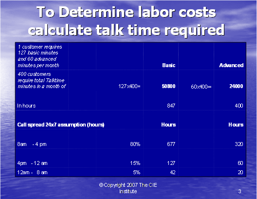 根據(jù)圖表12,我們可以算出第二種方式的利潤(rùn)百分比。如果我們假設(shè)每個(gè)客戶每年的收入是20,000美元,其中分配給呼叫中心部門的收入是20%。我們每個(gè)客戶每月的收入是333.33美元,每個(gè)客戶月的成本是223.88美元(參見(jiàn)圖表10)。這導(dǎo)致我們來(lái)自每個(gè)客戶每月的利潤(rùn)是109.46美元——這將產(chǎn)生33%的利潤(rùn)率。