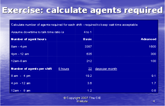 在我們計(jì)算出所需的座席數(shù)之前,我們必須了解一個(gè)座席的付薪工作時(shí)間和他的通話時(shí)長(zhǎng)的區(qū)別,通話時(shí)長(zhǎng)是座席真正花在電話上面對(duì)客戶的時(shí)間。一個(gè)座席不會(huì)一直處理電話,其它的時(shí)間用于培訓(xùn),休息,與主管獨(dú)處,部門會(huì)議,公司內(nèi)部為給客戶提供準(zhǔn)確的回答而進(jìn)行研究,對(duì)內(nèi)對(duì)外寫(xiě)郵件,準(zhǔn)備下一個(gè)客戶的電話。在每個(gè)呼叫中心中,通話時(shí)長(zhǎng)和停工時(shí)長(zhǎng)的比率是不同的。對(duì)于復(fù)雜易變的產(chǎn)品,花在培訓(xùn)上的時(shí)間會(huì)更多。在新產(chǎn)品被頻繁介紹的呼叫中心,就需要更多的時(shí)間去研究關(guān)于新產(chǎn)品的回答。為了更精確,一個(gè)座席一周的工作時(shí)長(zhǎng)應(yīng)該與其通話時(shí)長(zhǎng)相比較,以便真正確定通話時(shí)長(zhǎng)與停工時(shí)長(zhǎng)的比率。在我們的例子中,我們假設(shè)停工時(shí)長(zhǎng)和通話時(shí)長(zhǎng)的比率為4:1,也就是說(shuō),每1小時(shí)通話時(shí)間,相對(duì)應(yīng)4小時(shí)停工時(shí)間。