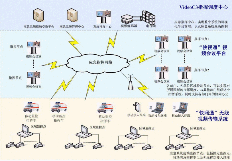 C3I視頻應(yīng)急指揮協(xié)同系統(tǒng)在政府IP網(wǎng)絡(luò)中處于城市的神經(jīng)中樞。它將政府各個(gè)部門、單位聯(lián)系成為一個(gè)整體。在C3I視頻應(yīng)急指揮協(xié)同系統(tǒng)的前端,由"快照通"無線視頻傳輸系統(tǒng)對(duì)政府所屬各個(gè)單位進(jìn)行實(shí)時(shí)監(jiān)控,時(shí)刻掌握現(xiàn)場(chǎng)動(dòng)態(tài),該部分支持固定點(diǎn)監(jiān)控,也支持移動(dòng)指揮點(diǎn)和無線移動(dòng)接入終端,保證了前方工作的靈活、機(jī)動(dòng)性;在系統(tǒng)的指揮中心部分,由VideoC3指揮調(diào)度中心來支持,它一方面需要對(duì)前端的監(jiān)控信息進(jìn)行控制,同時(shí),要對(duì)整個(gè)政府進(jìn)行綜合管理調(diào)度,在發(fā)生突發(fā)狀態(tài)的時(shí)刻,現(xiàn)場(chǎng)前端"快照通"捕獲的相應(yīng)信息通過C3I系統(tǒng)平臺(tái),迅速傳遞至指揮中心部分,政府管理人員通過VideoC3指揮調(diào)度中心對(duì)前端進(jìn)行遠(yuǎn)程指揮,在第一時(shí)間緊急處理現(xiàn)場(chǎng)突發(fā)事件;在整個(gè)C3I系統(tǒng)中,政府各個(gè)部門、單位之間通過"快視通"視頻會(huì)議平臺(tái)進(jìn)行辦公交流,支持各部門間的協(xié)同辦公,同時(shí),也可以通過其實(shí)現(xiàn)對(duì)所屬區(qū)域的指揮調(diào)度。