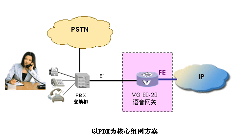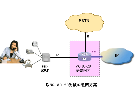將VG 80-20連接在在PBX和PSTN網(wǎng)之間,使用VG 80-20的一個E1語音接口連接PSTN,另一個E1語音接口連接PBX。由語音網(wǎng)關(guān)根據(jù)撥號策略決定使用PSTN呼叫還是VoIP呼叫,實(shí)現(xiàn)自動選路功能。這樣可以在撥號方式和電話號碼也不需要作任何改變的情況下,實(shí)現(xiàn)長途旁路IP電話功能。
