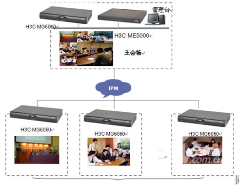 在主會場,分會場的會議室配備H3C高清視訊終端MG6060。H3C MG6060終端支持H.263、H.264等視頻編解碼協(xié)議,并采用了專有的視頻前、后處理技術(shù),使得圖像質(zhì)量大大提升,在周圍環(huán)境光照較差或者會場顏色搭配不甚和諧的情況下,仍舊能夠得到清晰、自然的圖像。視頻功能主要特色功能包括動態(tài)4CIF高清圖像、H.239雙視頻流傳送、畫中畫(PIP)、雙屏顯示、分屏顯示、VGA輸入、VGA輸出、桌面?zhèn)魉、圖像屏蔽、圖像參數(shù)調(diào)整等。有關(guān)H3C