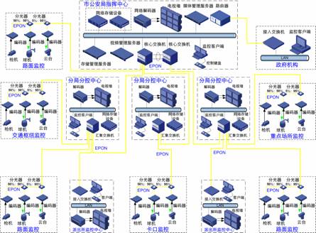 一般說來,城市監(jiān)控系統(tǒng)的網(wǎng)絡承載平臺要求建設專網(wǎng)或者VPN網(wǎng)絡。對于光纖資源較為豐富的城區(qū),可以使用數(shù)字SFP光纖接入,一個前端攝像頭對應一條光纖;在光纖資源較少的區(qū)域,可以使用EPON(無源光網(wǎng)絡)技術(shù),一芯光纖上可以同時接入多個前端攝像頭,大量節(jié)約了光纖資源和光纖租用成本;對于較為復雜的環(huán)境,不適合進行布線,可以采用無線接入的方式,降低施工成本。
