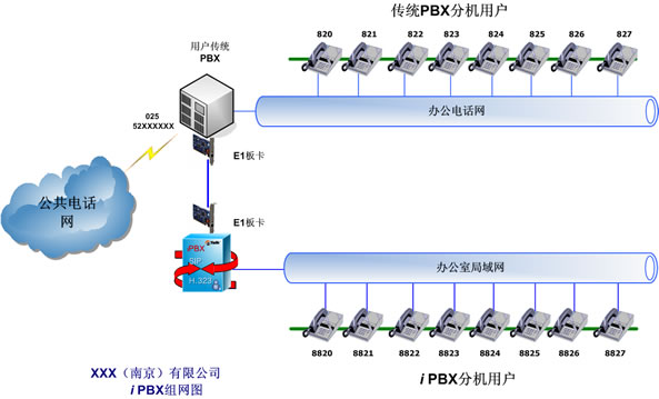 該用戶購(gòu)買eTalk iPBX系統(tǒng)一套,設(shè)置于其所屬開(kāi)發(fā)中心機(jī)房,利用現(xiàn)存辦公室局域網(wǎng)布設(shè)分機(jī)。通過(guò)E1板卡與原有傳統(tǒng)PBX連接,實(shí)現(xiàn)與傳統(tǒng)PBX分機(jī)用戶之間的互相撥打。傳統(tǒng)PBX分機(jī)用戶同時(shí)也能享受eTalk
