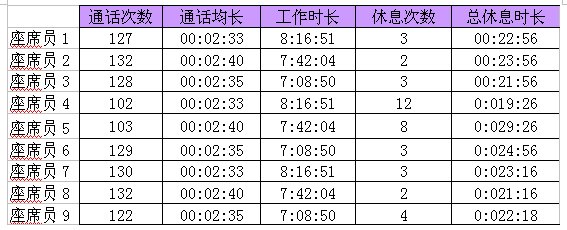 上面這張表格,畫出的就是9個座席員的話務數(shù)據(jù)情況,分別列出了通話次數(shù)、通話均長、工作時長、休息次數(shù)、總休息時長這五個KPI指標,你可以看的出來是哪一個座席員在呼攸嗎?
