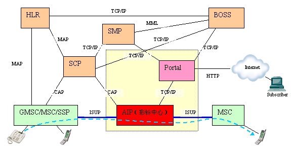 例如華為移動(dòng)智能網(wǎng)彩鈴方案的主要流程包括呼叫流程和管理流程,屬于主叫端局觸發(fā)方式。在主叫端局的被叫流程中通過SCP下發(fā)帶有路由前綴的Connect信令把呼叫轉(zhuǎn)移到AIP(彩鈴中心),AIP橋接呼叫到被叫端局,個(gè)性化鈴音在被叫端局發(fā)送ACM之后屏蔽普通鈴音,向主叫端局播放被叫定制的彩鈴音。管理流程需要AIP、SCP和MSC的配合,主叫用戶撥打彩鈴管理流程接入碼觸發(fā)到SCP,SCP判斷帳戶權(quán)限通過后,下發(fā)ETC信令,讓MSC和AIP建立臨時(shí)連接,由AIP進(jìn)行管理流程的操作。系統(tǒng)結(jié)構(gòu)圖如圖2所示,這種方式屬于"有迂回"方式。
