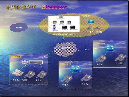 。。首先我們需要這4個地點都有自己的網(wǎng)絡(luò)接入,最好是寬帶。以北京總部為列,如果將Xrainbow系統(tǒng)放在北京總部,這就需要北京總部這邊有一個固定IP地址的網(wǎng)絡(luò)接入,其他分公司不需要固定ip地址,只要可以上網(wǎng)就可以登錄到北京總部的Xrainbow系統(tǒng)。這樣企業(yè)與分支機構(gòu)之間就實現(xiàn)了零話費,同時還可以提供傳真業(yè)務(wù)。另外終端設(shè)備可以隨意移動,只要可以上網(wǎng)的地方就可以接入我們的終端設(shè)備,免去了因公司的發(fā)展或者搬動而要去申請初裝大量電話的煩惱。