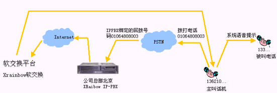 - 跨地域來(lái)電轉(zhuǎn)接,比如某個(gè)分支機(jī)構(gòu)的客戶(hù)撥叫該分支機(jī)構(gòu)電話,電話接起后,如果客戶(hù)需求沒(méi)有得到順利的答復(fù),在客戶(hù)電話保持的情況下,可以將電話轉(zhuǎn)接到在全國(guó)的任何一個(gè)IPPBX分機(jī)上。