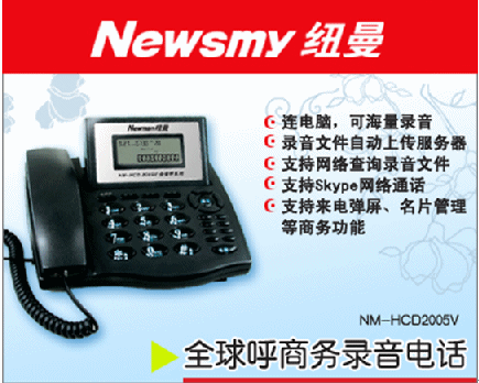 紐曼公司通訊產(chǎn)品負(fù)責(zé)人介紹,NM-HCD2005V就是一款強(qiáng)大的通訊終端,用USB連接線將其與電腦連接,可實(shí)現(xiàn)四大超強(qiáng)增值功能:1、連電腦,可海量錄音;2、錄音文件自動(dòng)上傳服務(wù)器,支持網(wǎng)絡(luò)查詢錄音文件;3、支持Skype等VoIP網(wǎng)絡(luò)通話;4、支持來(lái)電彈屏、名片管理、屏蔽騷擾等商務(wù)功能。