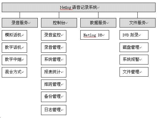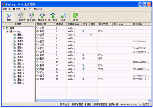 Netlog系統(tǒng)中控制臺是一個統(tǒng)一配置和管理的平臺,可以部署在網絡內的任意一臺主機上,各個功能模塊都可以單獨工作,也可以同時使用,控制臺所有模塊可以通過系統(tǒng)導航(ToolBar)來引導啟動。用戶可以通過控制臺操作網絡上所有記錄服務、數(shù)據服務和文件服務?刂婆_作為最終用戶終端可以完成用戶的所有操作,設置每個服務器甚至每個通道的屬性、執(zhí)行各種用戶操作、指定服務的工作方式、錄音查詢、錄音管理、輸出報表、排班等?刂婆_根據用戶權限的不同限定用戶的操作,更好的保障了系統(tǒng)的運行和語音記錄文件的安全。