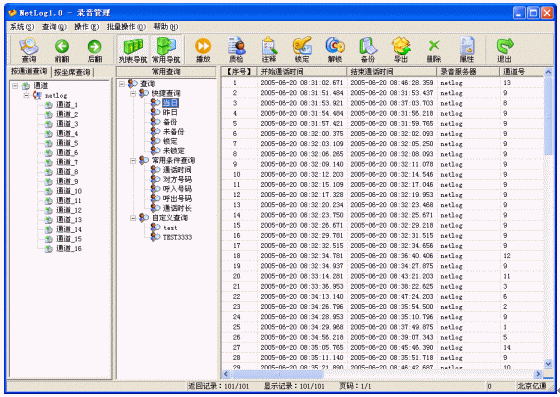 主要是對錄音進行管理,分為錄音查詢和錄音操作兩大部分。錄音查詢除了提供常規(guī)的按條件組合查詢外,還提供了人性化的常用查詢,系統(tǒng)已經內置了很多常用查詢,例如:當日查詢,您只要直接選擇當日查詢,就可以馬上開始查詢當日的所有錄音,減少您每次輸入查詢條件的工作量,并且還可以靈活的自定義常用查詢,充分滿足您的查詢要求。錄音操作提供了方便快捷的操作方式。批量數(shù)據的處理能力可以讓用戶以最快的速度從煩瑣的工作中解脫出來。詳細的記錄信息可以滿足所有用戶的要求,特定信息的加入可以滿足特殊行業(yè)的使用,如呼叫中心行業(yè)、服務臺、傳呼臺等。