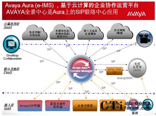 Avaya推出了新一代的企業(yè)通信架構(gòu)Aura。Aura是基于SIP的軟交換平臺(tái),是基于SIP的通信服務(wù)于應(yīng)用的集成。Avaya將統(tǒng)一通信和呼叫中心都建置在Aura的SIP架構(gòu)之上,而各種通信設(shè)備(哪怕這些設(shè)備不是Avaya的產(chǎn)品)都連接在Aura的會(huì)話管理器(Session