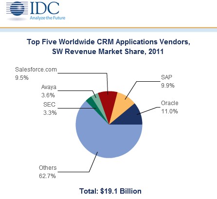 根據(jù)IDC的調(diào)查數(shù)據(jù)顯示,目前就CRM市場(chǎng)來(lái)說(shuō),Salesforce和SAP正呈現(xiàn)出一種超越甲骨文,奪取領(lǐng)頭羊?qū)氉内厔?shì)。