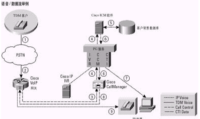 注意2:這一樣本語(yǔ)音/數(shù)據(jù)流描述了一個(gè)單地點(diǎn)IPCC實(shí)現(xiàn)。另外,可以將IPCC集成到一個(gè)多地點(diǎn)聯(lián)絡(luò)中心,并獲得ICM軟件所提供的可貫穿整個(gè)企業(yè)的、網(wǎng)絡(luò)級(jí)的路由預(yù)選功能所能帶來(lái)的好處。