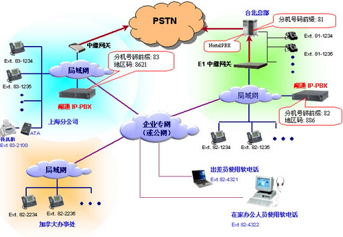 此系統(tǒng)方案不僅可以實(shí)現(xiàn)公司總部、分部、辦事處以及出差人員之間的完全免費(fèi)通話和傳真,還可以實(shí)現(xiàn)在設(shè)有網(wǎng)關(guān)的各個(gè)分支機(jī)構(gòu)之間實(shí)現(xiàn)虛擬長(zhǎng)途。例如,從上海分部撥打臺(tái)灣的客戶號(hào)碼,按照正常程序分機(jī)撥打外線電話需要先撥9+00886+客戶號(hào)碼。上海的耐通IP-PBX接到信號(hào)后發(fā)現(xiàn)目標(biāo)地區(qū)設(shè)有系統(tǒng)內(nèi)部網(wǎng)關(guān),于是將呼叫經(jīng)由臺(tái)北IP-PBX及網(wǎng)關(guān),通過(guò)臺(tái)京的集團(tuán)電話交換機(jī)出局接入到客戶端。而此呼叫只產(chǎn)生臺(tái)北的市話費(fèi)用。公司的出差人員或者在家辦公人員也可以使用軟電話通過(guò)賓館或者家里的寬帶網(wǎng)絡(luò)接入公司的耐通網(wǎng)絡(luò)語(yǔ)音通信系統(tǒng),免費(fèi)與總部和各分支機(jī)構(gòu)通訊,同時(shí)以市話的價(jià)格撥打總部和各分公司當(dāng)?shù)氐墓潭娫捇蚴謾C(jī)。