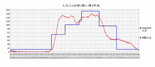 要用EXCEL畫這樣的比較圖,其實(shí)不難。因?yàn)槠饺蘸图偃盏碾娫捔磕P筒灰粯,所以一般?huì)畫兩張,一張是平日的電話量和人力比較,一張是假日的電話量和人力比較。下面就是一張平日的電話量和人力比較圖,一天24小時(shí)的情況。紅色的是每隔15分鐘的電話量,藍(lán)色的是實(shí)際安排的人力。