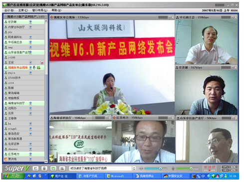 2007年8月16日,視維視頻會議V6.0新產(chǎn)品網(wǎng)絡(luò)發(fā)布會在美麗的泉城濟南舉行,山東省信息產(chǎn)業(yè)廳、濟南市信息產(chǎn)業(yè)局的領(lǐng)導、山東省電信等上級主管部門領(lǐng)導,視維產(chǎn)品新老用戶和有視頻會議需求的潛在客戶,國內(nèi)外合作伙伴,IT168、中國計算機報、電腦商報、C114、支點網(wǎng)、計算機世界、CTI論壇、投影時代等國內(nèi)知名媒體100多人參加了這次網(wǎng)絡(luò)發(fā)布會。在此次會議上,山大聯(lián)潤公司通過視頻會議與各地與會者進行了良好的溝通,同時這次發(fā)布會開創(chuàng)了用視頻會議發(fā)布新產(chǎn)品的先河。