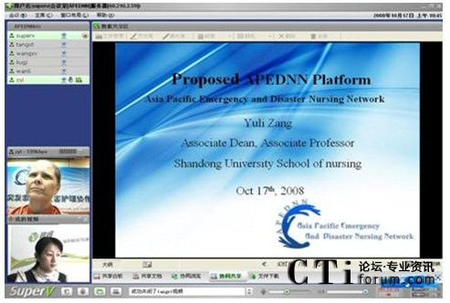 視維視頻會議系統(tǒng)良好的兼容性,使亞太地區(qū)各成員國的代表雖遠(yuǎn)隔千山萬水,依然可以實現(xiàn)無限溝通。視維視頻會議系統(tǒng)所提供的清晰流暢的音視頻使各成員國的代表無需走出國門,無需聚到一起,就可以輕松地網(wǎng)絡(luò)面對面的進(jìn)行交流,既可節(jié)約差旅費(fèi)用,又可避免舟車勞頓之苦,是各國代表有更多精力投入到工作中;視維的共享白板、共享文檔、文件下載等強(qiáng)大的數(shù)據(jù)協(xié)作功能可以使各國代表快速地共享更多的信息、資料,及時地開展越洋培訓(xùn)。近日網(wǎng)絡(luò)面對面地討論第三屆APEDNN的進(jìn)程及各項議題就是一次典型的應(yīng)用之一,不僅節(jié)約了差旅和時間成本,而且提高了工作效率,拉近世衛(wèi)各成員國之間的距離,天涯若比鄰,是各國代表在工作上更為默契,提高人類應(yīng)對突發(fā)事件與災(zāi)害的能力。