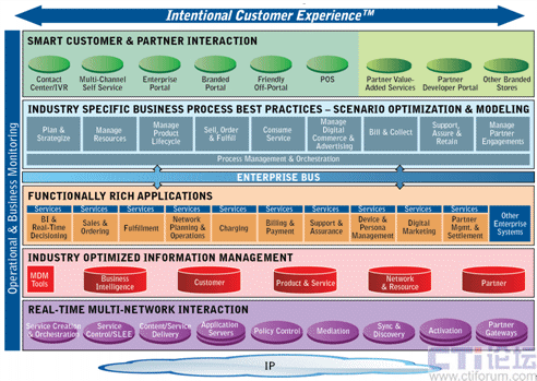 其次,CES改變了現(xiàn)有的業(yè)務(wù)應(yīng)用層將功能和流程融合在一起的模式,對流程和功能進(jìn)行了分離。實(shí)際上,應(yīng)用功能和流程結(jié)合得越緊密,系統(tǒng)的適應(yīng)性就會越差,對新業(yè)務(wù)和新產(chǎn)品的響應(yīng)時(shí)間就越長,CES將業(yè)務(wù)應(yīng)用層分為流程層和應(yīng)用功能層,流程和功能的分離極大的提高了系統(tǒng)靈活性,降低了系統(tǒng)集成的復(fù)雜程度和成本開銷,滿足了新業(yè)務(wù)和新產(chǎn)品快速上市的要求。在流程層,運(yùn)營商不僅可以選擇采用Amdocs在25年服務(wù)經(jīng)驗(yàn)的基礎(chǔ)上總結(jié)的業(yè)界最佳實(shí)踐的業(yè)務(wù)流程,也可以選擇采用企業(yè)現(xiàn)有的業(yè)務(wù)流程;在應(yīng)用功能層,Amdocs全系列軟件產(chǎn)品將更加模塊化,運(yùn)營商可以選擇Amdocs全系列軟件產(chǎn)品,也可以選擇其中的個(gè)別或部分產(chǎn)品,這種高度模塊化的產(chǎn)品將以更快的速度集成到運(yùn)營商已有的IT框架中。