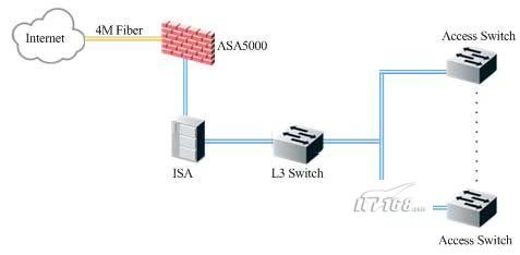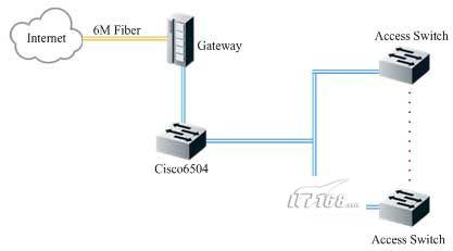 客房局域網(wǎng)通過一條6M的光纖接入CNC網(wǎng)絡(luò),網(wǎng)關(guān)設(shè)備承擔(dān)了DHCP、NAT和流量限制等功能,同時在思科6504上安裝有安全板卡,對內(nèi)部網(wǎng)絡(luò)安全進(jìn)行加強(qiáng)和防御。由于每個客房有2~3個信息點,客房局域網(wǎng)總共有1300個左右的信息點。