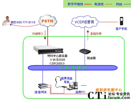 唐和唐客戶服務(wù)中心系統(tǒng)由企業(yè)局域網(wǎng)、呼叫中心服務(wù)器(含MVB2000交換平臺、CSR2000座席系統(tǒng)、數(shù)字中繼接口板)、語音網(wǎng)關(guān)及座席話盒耳機和座席電腦組成的。呼入采用當?shù)仉娦艛?shù)字中繼線路作為呼入線路;呼出采用VOIP運營商落地線路作為呼出線路。由呼叫中心系統(tǒng)自動完成呼入電話與呼出電話的路由,系統(tǒng)功能包括IVR語音導(dǎo)航、來電彈屏、客戶管理、通話錄音、CDR報表、自動外撥、點擊撥號等。