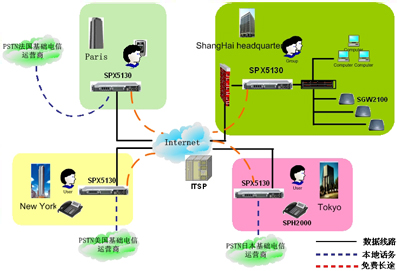 隨著公司在全世界開設(shè)眾多的部門,IP電話技術(shù)將會是不同分公司之間實現(xiàn)低費(fèi)用高品質(zhì)語音通訊的方式。SINOCO公司的IP-PBX 系統(tǒng)解決方案,利用 SPX-5130設(shè)備通過互連網(wǎng)連接到公司的各個分支機(jī)構(gòu),提供分級體系結(jié)構(gòu),更進(jìn)一步提供了可靠的,靈活的語音通訊解決方案,從而滿足公司快速回應(yīng)客戶的需求。同時,它也降低了總部和分部之間的電話費(fèi)用。總部和分部間昂貴的國際電話費(fèi)用將不再存在, 而且享受高品質(zhì)的語音通訊質(zhì)量。
