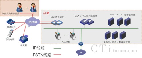 設(shè)備介紹:H3C VCX V7005完成呼叫處理;結(jié)合網(wǎng)音中間件軟件完成自動語音應(yīng)答、人工智能排隊(duì)、錄音、話務(wù)統(tǒng)計輸出等功能;MSR語音網(wǎng)關(guān)完成PSTN落地功能。