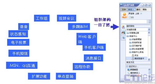 UcSTAR :Unified Communication Star,是深圳市擎旗信息技術有限公司推出的企業(yè)級融合通信平臺。是融合多種通訊手段(IM、文件、視頻、語音、EMAIL、SMS、電話、VOIP、MSN/QQ互通),融合企業(yè)的多種應用系統(tǒng)緊密集成(OA、CMS、ERP、EIP、Portal、網(wǎng)站、應用軟件),交流對象和交流內(nèi)容可管理,可控制,可擴展,輕松實現(xiàn)部署企業(yè)的統(tǒng)一工作平臺。 UcSTAR能統(tǒng)一消息、統(tǒng)一溝通、統(tǒng)一管理、隨意選擇多種溝通手段,深航一直在找這樣的一種產(chǎn)品,公司信息部門從上到下給予極高的重視,商務的過程也都開了綠燈,一路順暢。