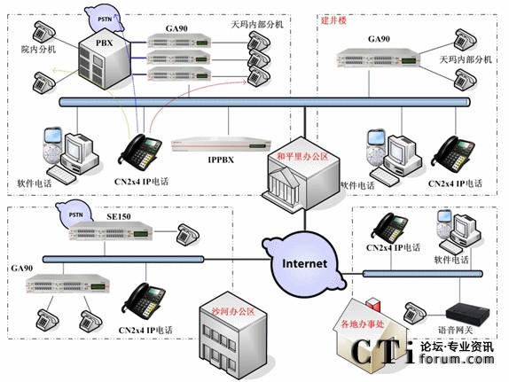 具體情況是:和平里的總部與沙河辦公區(qū)之間為網(wǎng)絡(luò)專線,并有公網(wǎng)出口。各辦事處使用ADSL撥號上網(wǎng)方式?偛康姆桨冈O(shè)計中,使用了5臺GA90網(wǎng)關(guān),兩臺IPPBX以及多部IP話機(jī)和軟件電話。和平里辦公區(qū)工位數(shù)量為120左右,其中多數(shù)工位需要部署模擬話機(jī),個別工位屬于非固定的移動工位,需要部署CN2x4