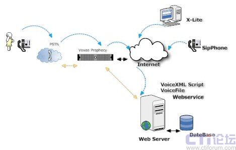 Voxeo Prophecy 是一個基于SIP、VoiceXML、CCXML標準的語音應用開發(fā)和部署平臺,可以讓用戶快速高效的實施自己的IVR系統(tǒng)。大家都知道,傳統(tǒng)的IVR解決方案廠商,IVR系統(tǒng)架構都是基于傳統(tǒng)的CTI硬件來實現(xiàn)的,無論是交換機方式還是語音卡方式,都是脫離不開硬件廠家的媒體資源。Voxeo Prophecy 是完全基于互聯(lián)網(wǎng)SIP 協(xié)議,同時也是VoiceXML標準的聯(lián)盟成員,不受任何硬件廠家的硬件限制。VoiceXML 是一種標準的標記語言,用于建立語音界面,好比是我們所熟知的HTML 語言,Voxeo Prophecy 可以理解為傳統(tǒng)的語音瀏覽器,可以解釋VoiceXML 腳本并向用戶顯示語音信息,也可以接受用戶的語音請求,實現(xiàn)互動。如下圖所示: